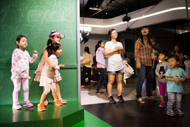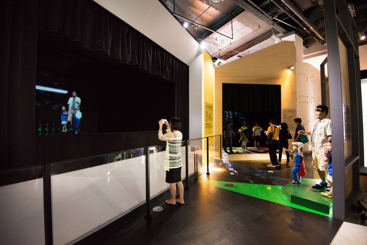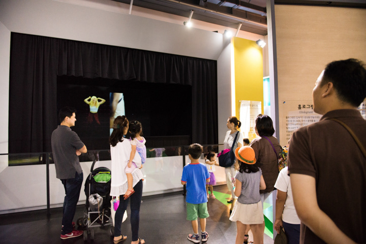 This hologram exhibit using a transparent film. children are able to learn along the fun dance with the 3D character. Through the blue screen is allowed to project the image of visitors in real time screen it is possible to produce a figure dancing together, using the sensor, various video effects will occur in the screen with user.