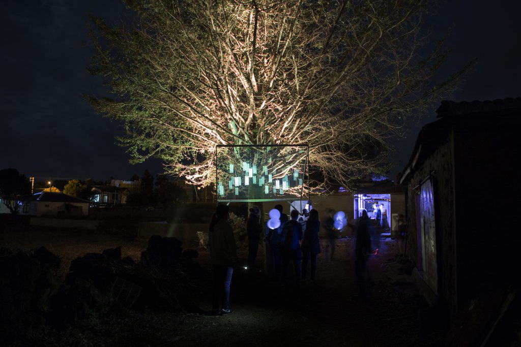 알마로꼬는 미디어를 연출하였습니다. 관람객이 축제 중앙에 위치한 신령 나무에 와서 자신의 소원을