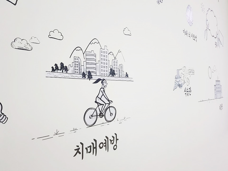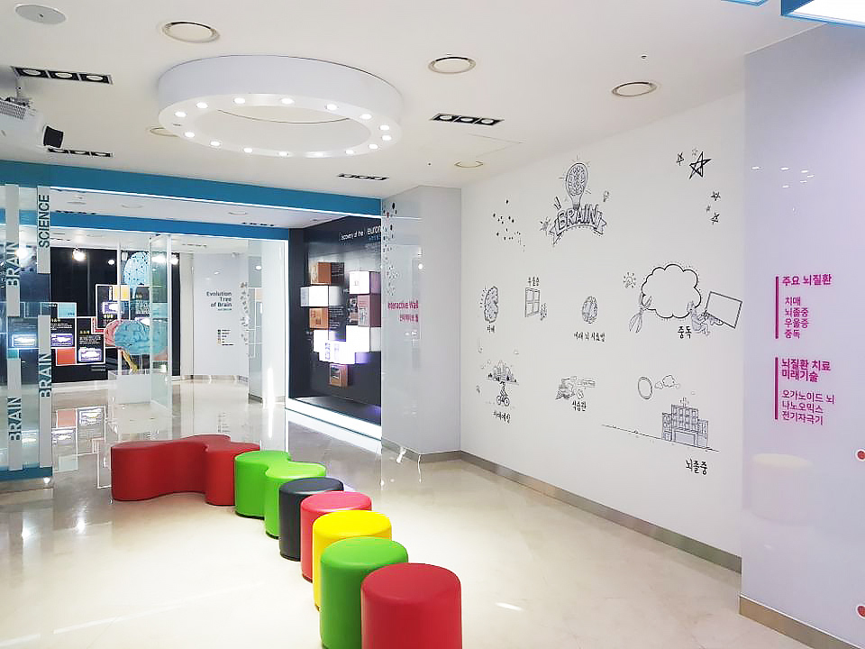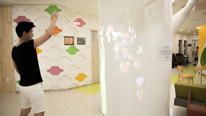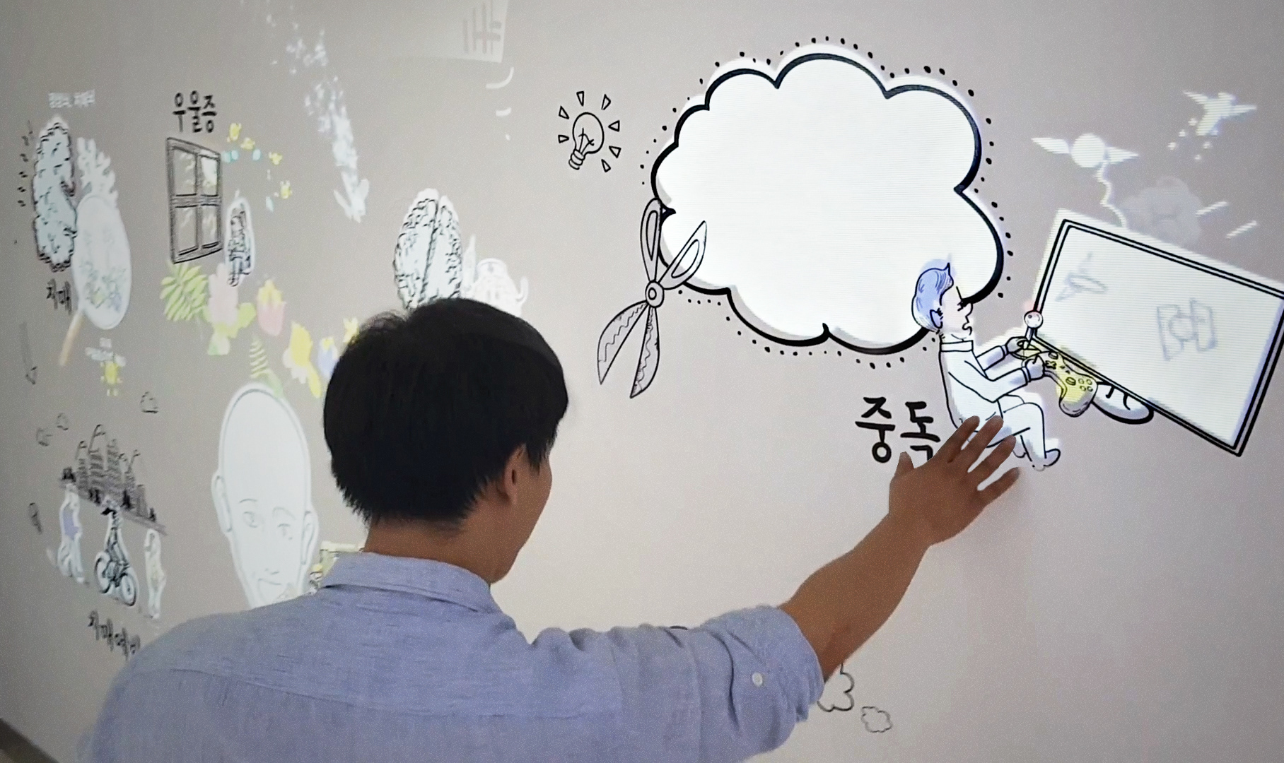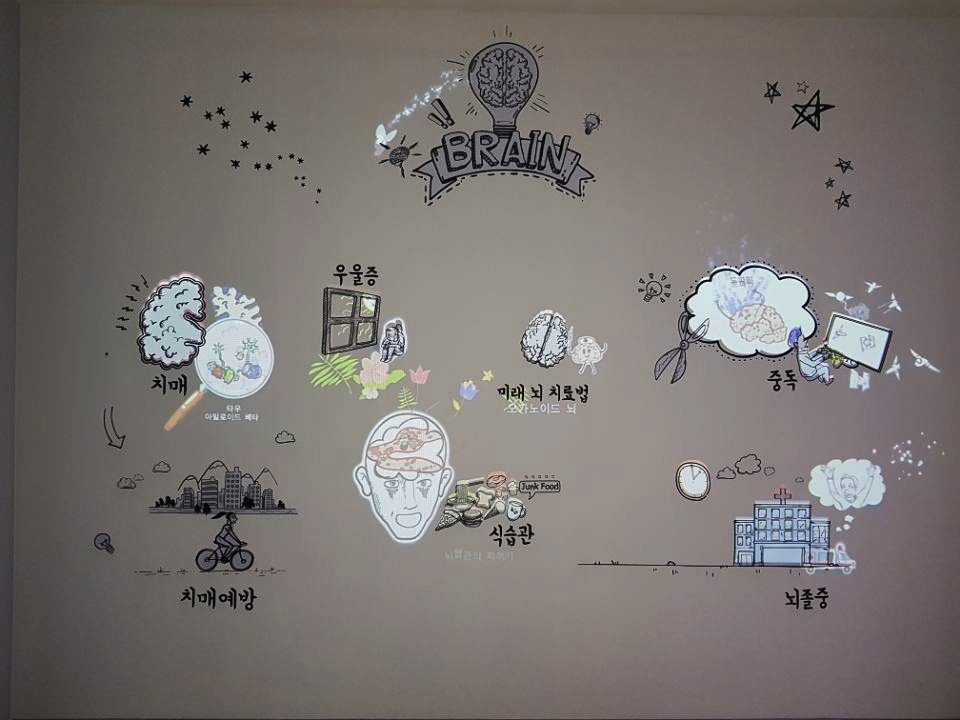 벽면에 시트지에 붙어 있는 그림을 손으로 터치하면 그 모양에 관련된 뇌 질환 영상이