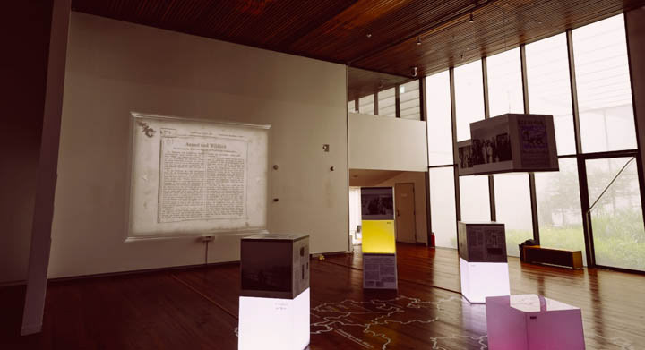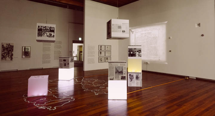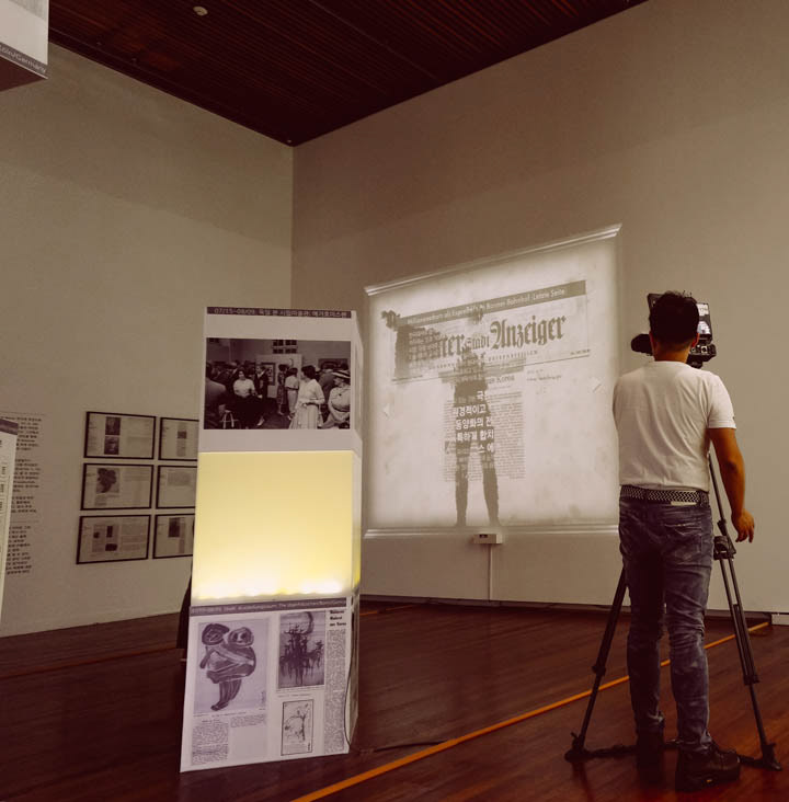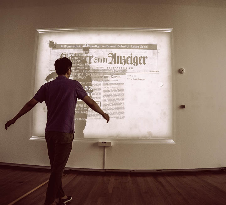 The silhouette of visitors to track the sensor ,Korean text hidden in the German newspaper article rear side. If the human silhouette over the image of the button located on the screen left and right, will be moving to the next page with the animation, Rather than merely the audience to read the newspaper, through the interaction of the audience and the work, you will be able to experience the more interesting moods.