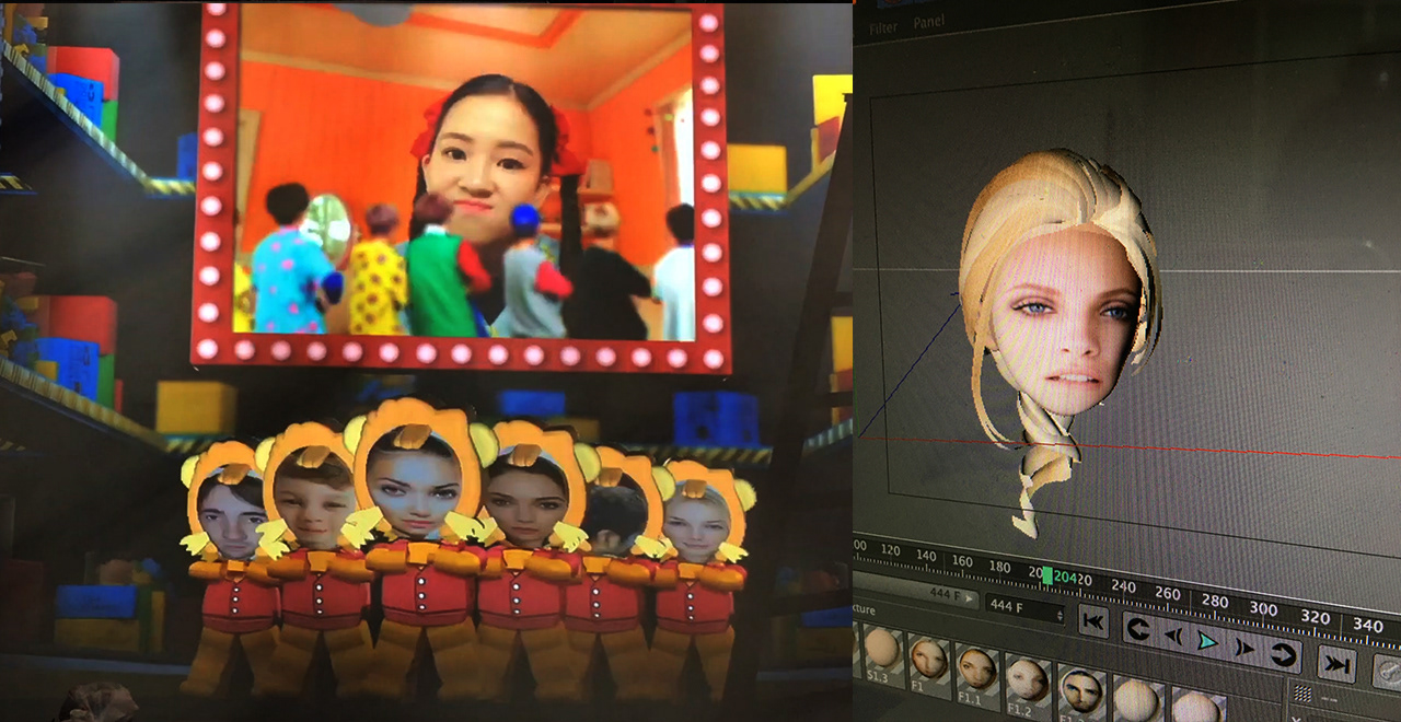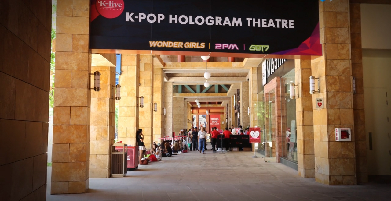 한류 바람이 불고 있는 싱가포르의 센토사 단지 안에 JYP 가수들의 퍼포먼스를 홀로그램으로 관람할 수 있는 공연장이 생겼습니다. 관람객이 입구에서 기다리는 동안 사진을 찍으면 얼굴이 실시간으로 합성되어, 공연 중 자신의 얼굴이 캐릭터와 동기화되어 화면에 나오게 됩니다. 공연을 즐기면서 관객이 직접 참여하고 있다는 재미를 동시에 느낄 수 있는 황홀한 경험입니다.
